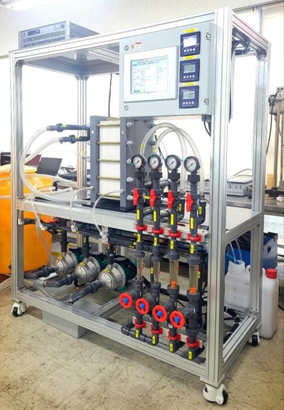 ED (electrodialysis) 전기투석 Labscale 장비 Specification Product Name ED PSL (2 L/hr, W720*L630*H800) Function Desalination, Concentration for ionic material in solution Applicable Model ED module 1ea (effective area 550cm2) Operating Capapcity Max. 2 L/hr Raw: 1,000 / Dilute: 100 / Concentrate: 4,000 (ppm lithium) Operating Condition Max. 15 L/min, Max. 1.5 bar, 5 - 60℃ System Input Power AC 220 V, ..